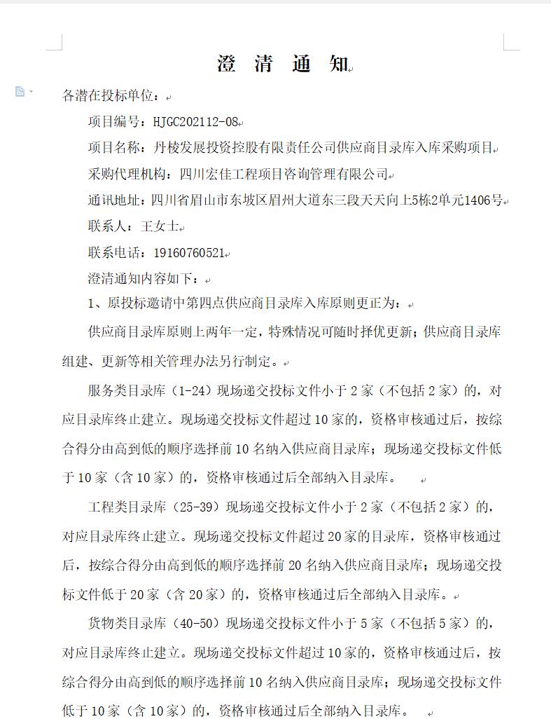 【丹發(fā)展公司】丹棱發(fā)展投資控股有限責(zé)任公司供應(yīng)商目錄庫入庫采購項(xiàng)目澄清通知