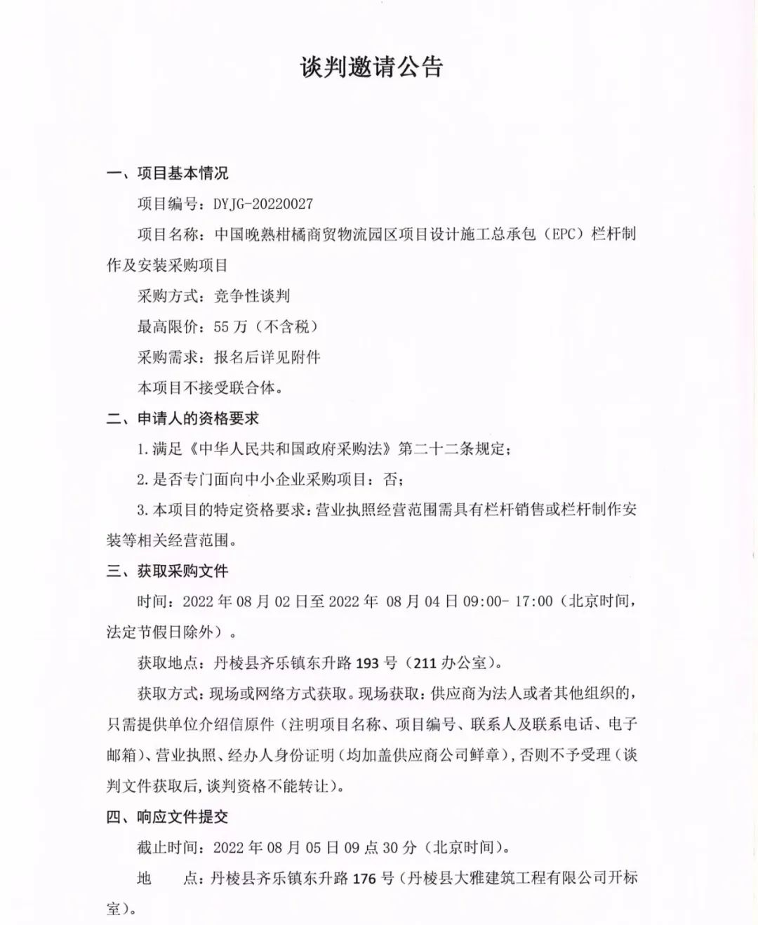 中國晚熟柑橘商貿(mào)物流園區(qū)項(xiàng)目設(shè)計(jì)施工總承包(EPC)欄桿制作及安裝采購項(xiàng)目談判邀請(qǐng)公告