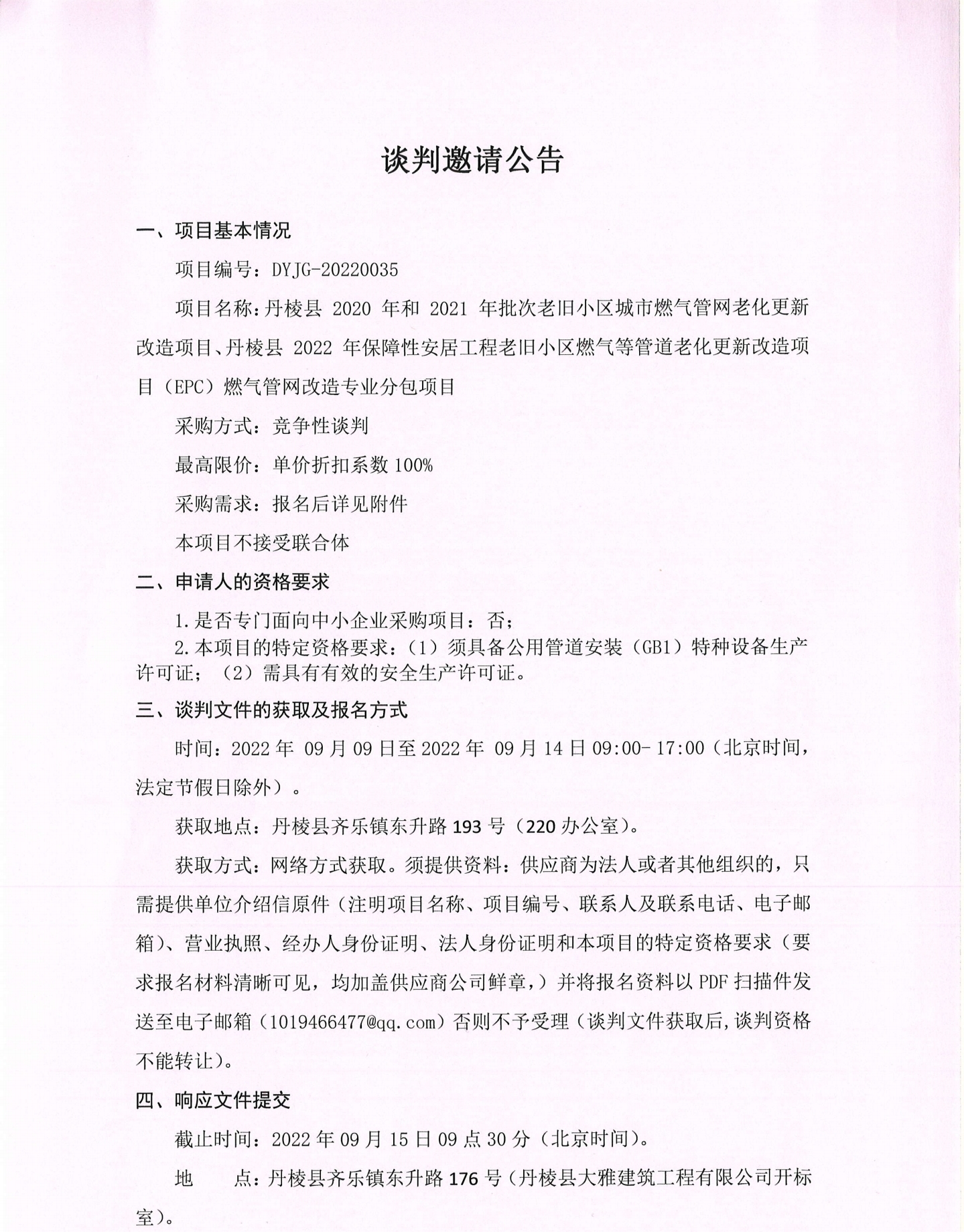 2020年和2021年批次老舊小區(qū)城市燃氣管網(wǎng)老化造專業(yè)分包更新改造項目、2022年保障性安居工程老舊小區(qū)燃氣管道老化更新改造項目(EPC)燃氣管網(wǎng)改造專業(yè)分包項目談判邀請公告