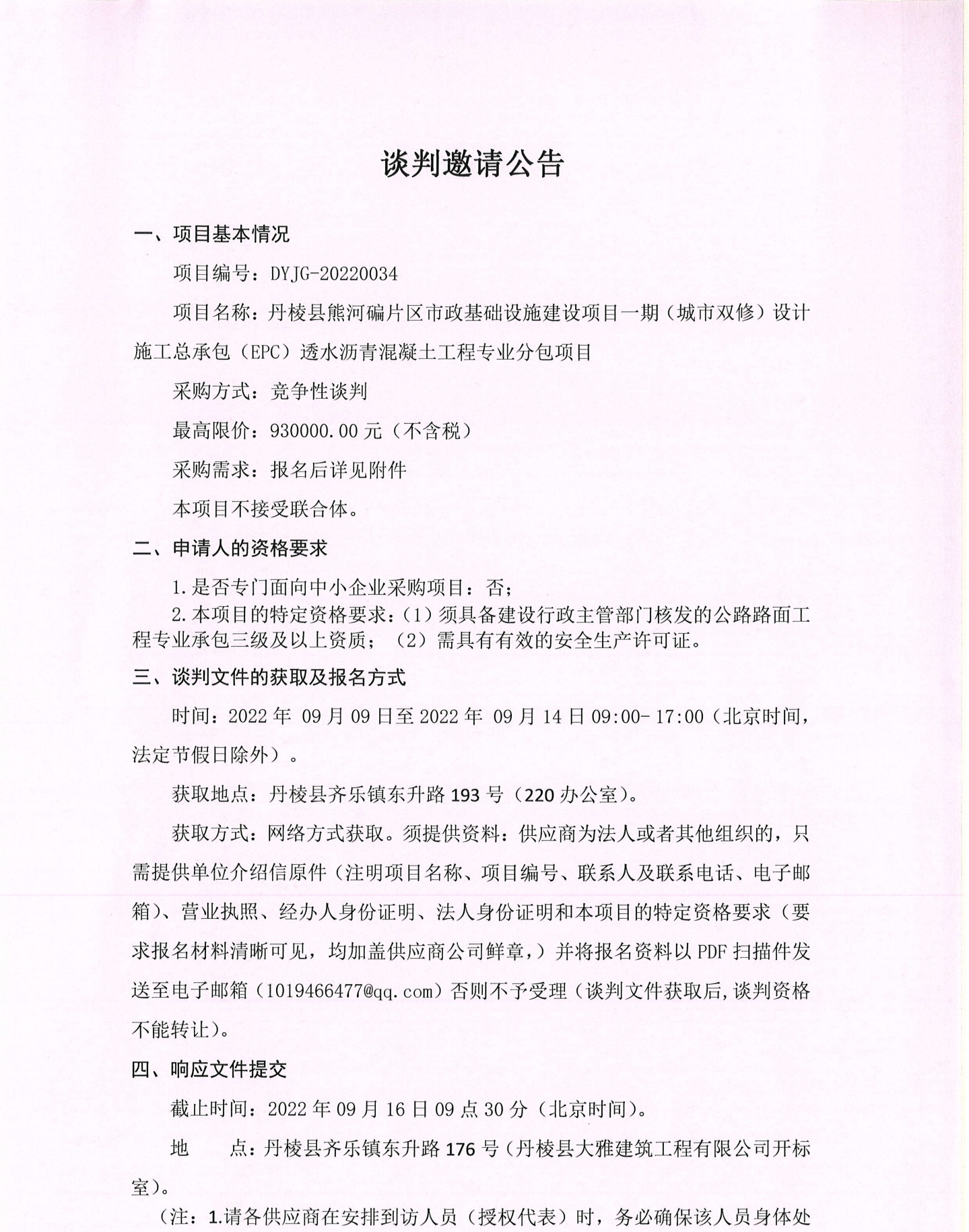 丹棱縣熊河碥片區(qū)市政基礎(chǔ)設(shè)施建設(shè)項(xiàng)目一期(城市雙修)設(shè)計(jì)施工總承包(EPC)透水瀝青混凝土工程專(zhuān)業(yè)分包項(xiàng)目談判邀請(qǐng)公告