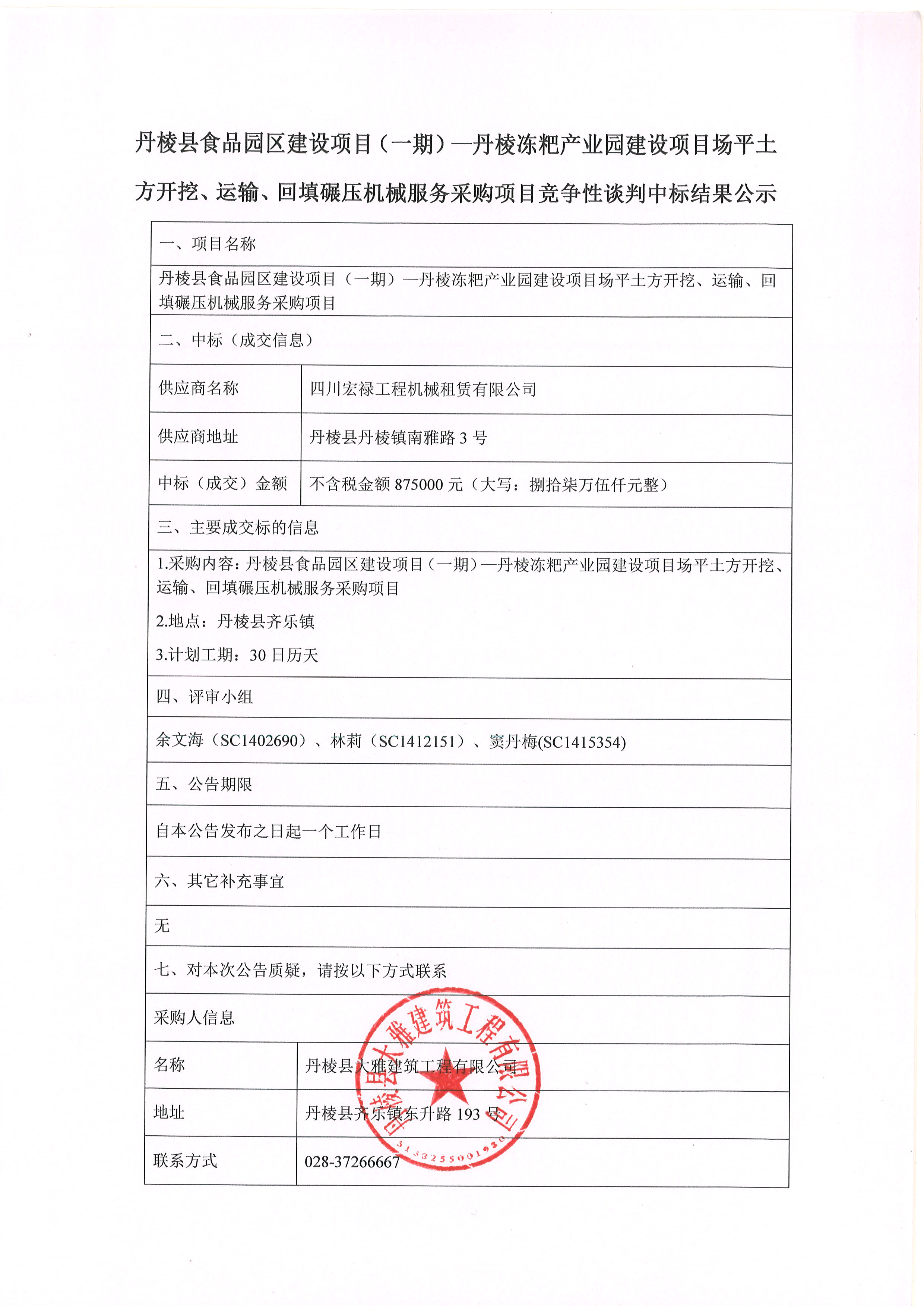 丹棱縣食品園區(qū)建設(shè)項(xiàng)目(一期)-丹棱凍粑產(chǎn)業(yè)園建設(shè)項(xiàng)目場(chǎng)平土 方開挖、運(yùn)輸、回填碾壓機(jī)械服務(wù)采購(gòu)項(xiàng)目競(jìng)爭(zhēng)性談判中標(biāo)結(jié)果公示