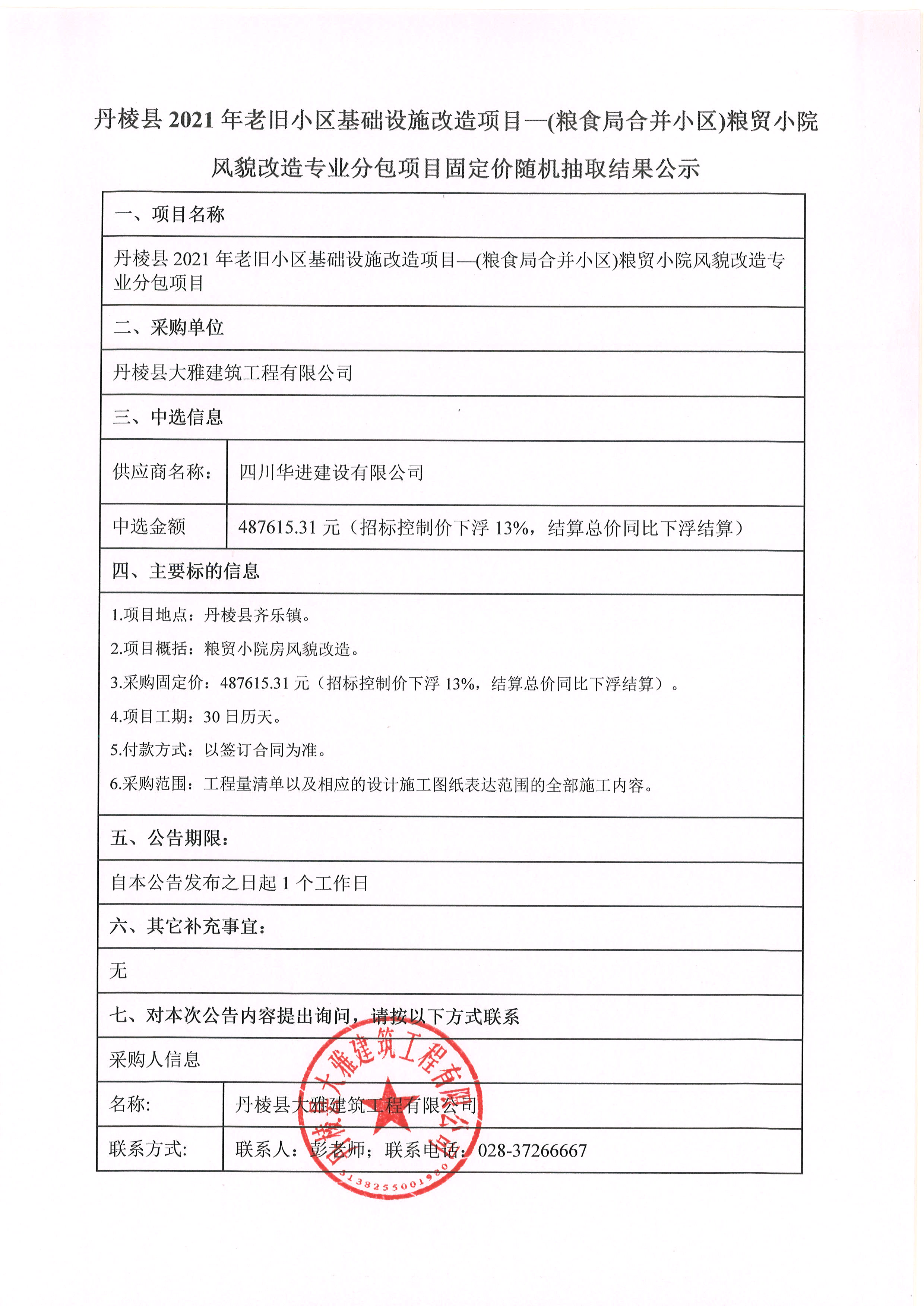 丹棱縣2021年老舊小區(qū)基礎(chǔ)設(shè)施改造項(xiàng)目一(糧食局合并小區(qū))糧貿(mào)小院 風(fēng)貌改造專業(yè)分包項(xiàng)目固定價(jià)隨機(jī)抽取結(jié)果公示