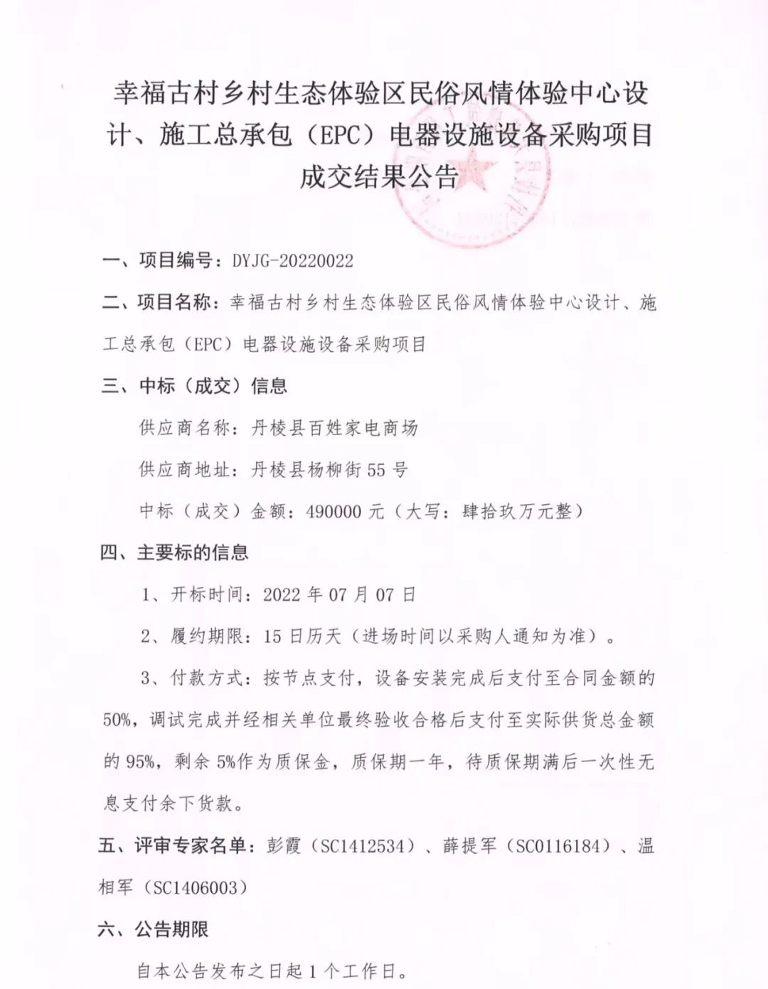 幸福古村鄉(xiāng)村生態(tài)體驗(yàn)區(qū)民俗風(fēng)情體驗(yàn)中心設(shè)計(jì)、施工總承包(EPC)電器設(shè)施設(shè)備采購項(xiàng)目成交結(jié)果公告