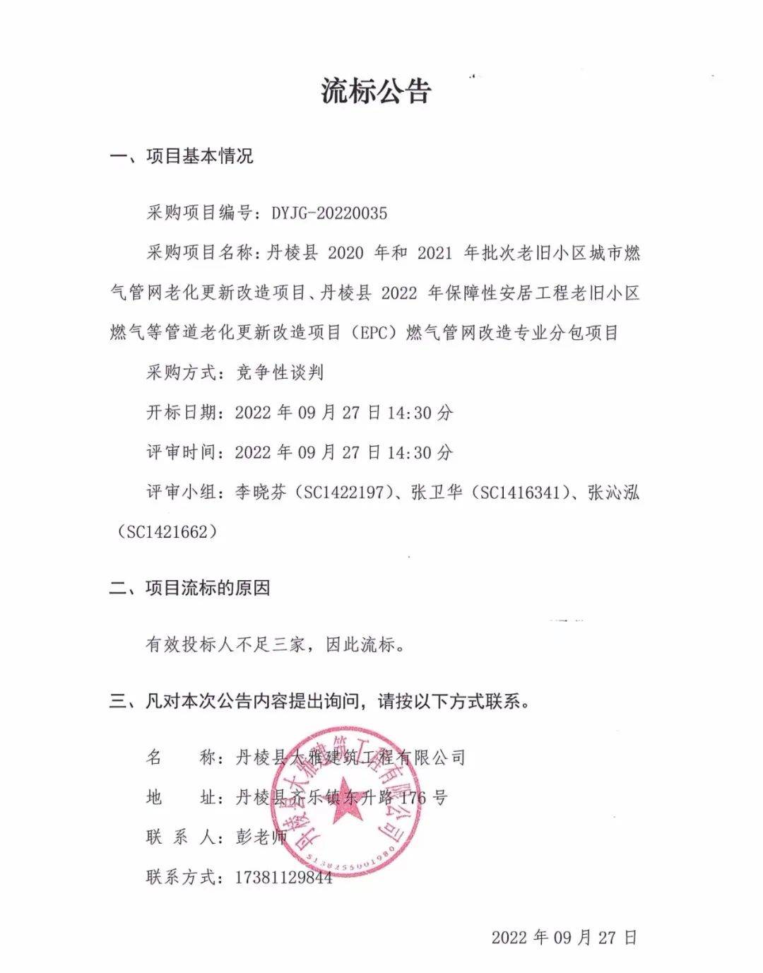 丹棱縣 2020 年、2021年及2022年批次老舊小區(qū)城市燃氣管網(wǎng)老化更新改造項目燃氣管網(wǎng)改造專業(yè)分包項目流標公告