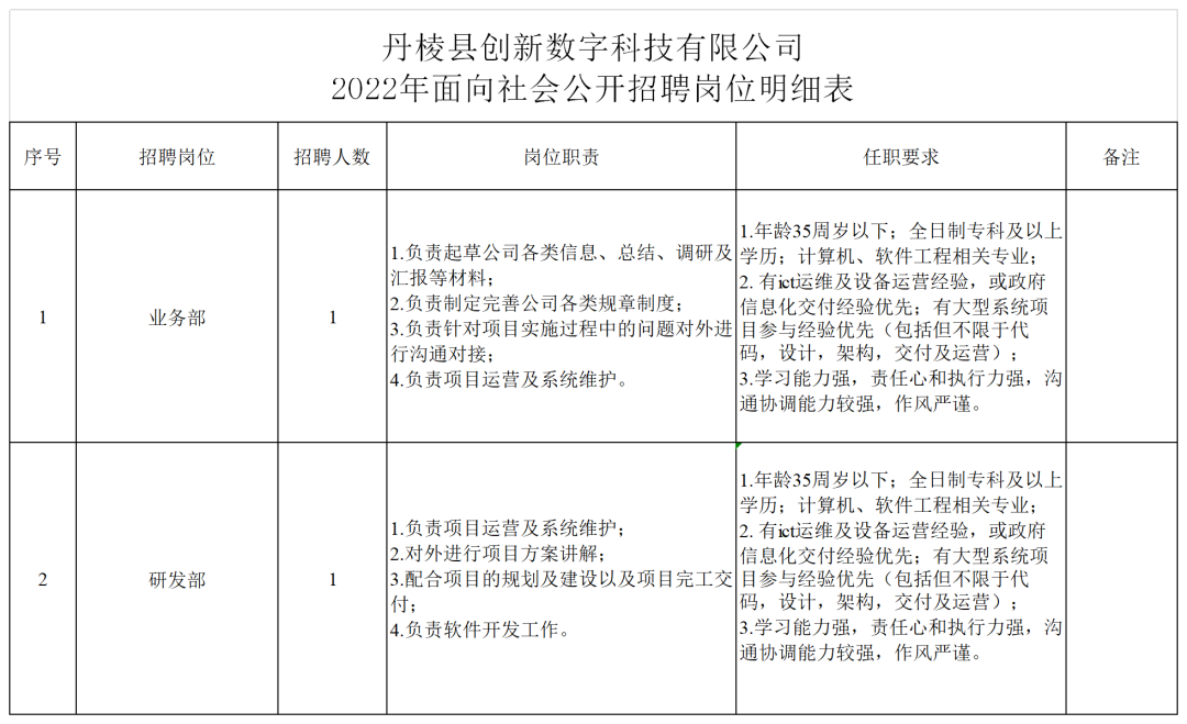 招聘崗位的學(xué)歷、專(zhuān)業(yè)、資歷、年齡等資格條件詳見(jiàn)附件《丹棱縣創(chuàng)新數(shù)字科技有限公司2022年面向社會(huì)公開(kāi)招聘崗位明細(xì)表》。