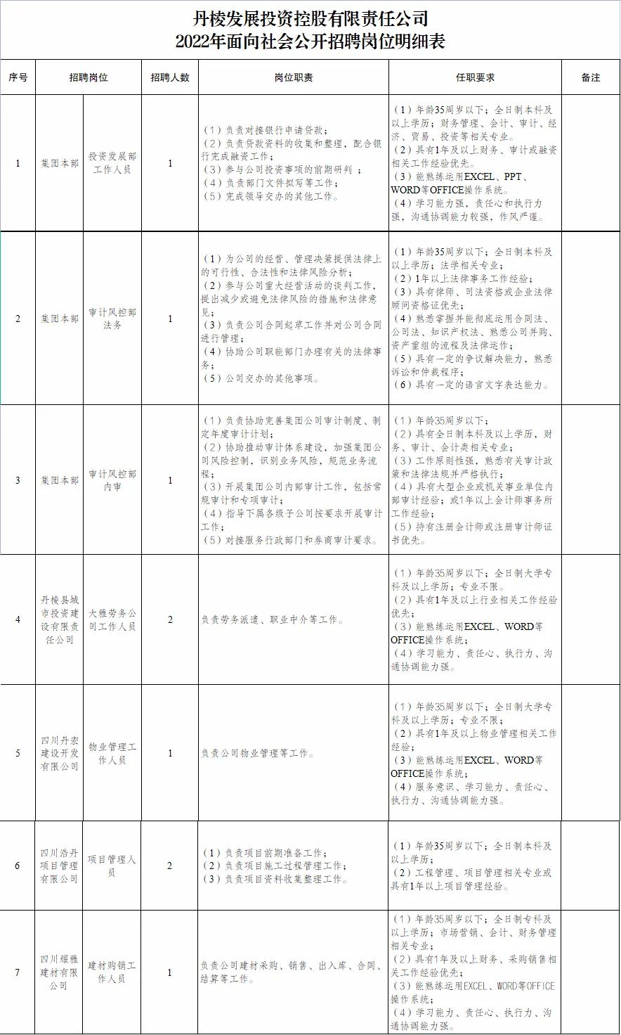 招聘崗位的學(xué)歷、專業(yè)、資歷、年齡等資格條件詳見附件《丹棱發(fā)展投資控股有限責(zé)任公司2022年面向社會公開招聘崗位明細(xì)表》。