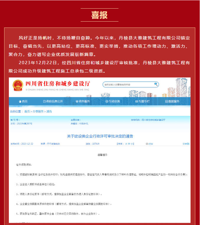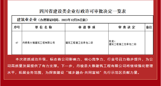 【縣大雅建筑公司】喜報(bào)!成功升級(jí)“建筑工程施工總承包二級(jí)”資質(zhì)!