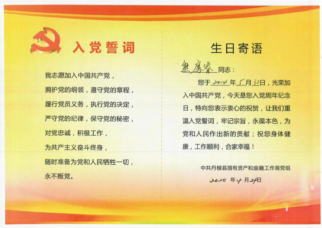 工作安排后,縣國資金融局黨組集體為5月入黨黨員過政治生日,縣國資金融局(縣金融服務中心)副主任茍永慶同志過生日的黨員們送上精心制作的“黨員政治生日卡”,勉勵黨員同志要“常思入黨初衷、銘記入黨誓詞、牢記黨員義務”,發(fā)揮黨員先鋒模范作用,在今后的工作中不斷創(chuàng)先爭優(yōu),做好表率。活動最后,全體黨員同志在縣國資金融局黨組成員、副局長潘國榮同志的帶領下重溫入黨誓詞、面對黨旗莊嚴宣誓。